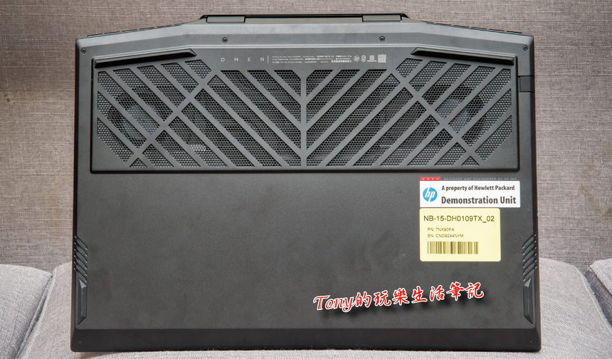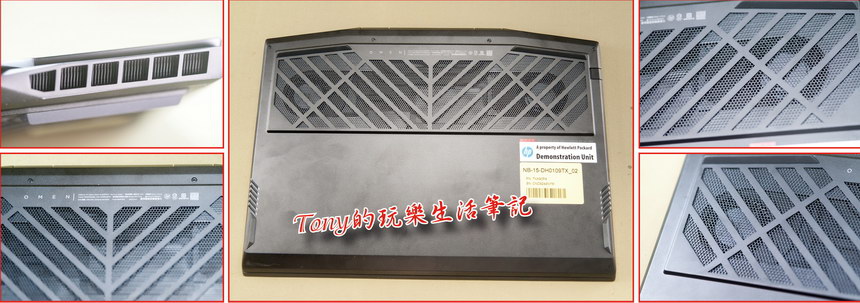 ▲就而在底部也跟過去有了不同的設計,兩邊加大的進氣口,加強了進氣的表現,加上了超靜音的風扇(還真是安靜,都用程式跑到100%的效能,溫度降溫表現很棒外,不特別注意都忘了風扇在轉動)。從照片的上方可以看到顯示面板也改用了兩個V型轉軸去做開合,在多次的開合測試下,我的感覺是比我的老筆電那種中間單軸式的還穩固,而且開合力道更適合,單手就可以開啟了,不必再用兩隻手去拉開。中間兩側看的到有兩個多段斜開孔,那就是使用了極高級的【丹麥BANG & OLUFSEN揚聲器】,這可真是全都把一些高檔的產品給集中在一起了,後面就來看看到底這次《HP OMEN 15筆記型電競電腦》的內部有哪些好物﹖