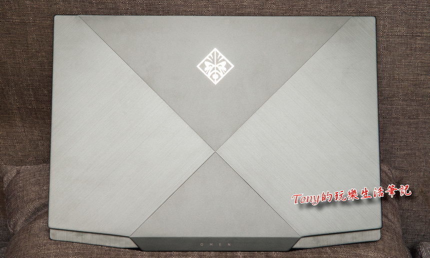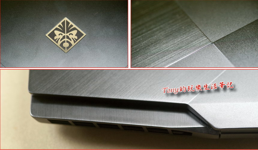 ▲正面背蓋(A面)雖然是使用塑料,但仍做成具有金屬感。整區分成四個大區塊,上下兩區是噴霧磨砂的設計,左右兩個區塊是髮絲紋,這部份特別有金屬感覺。最下方的旋轉軸是做斜面設計,並且兩邊做了一些退縮,可以看見鍵盤面(C面),斜面上也印上了很低調的【OMEN】的字樣來區別這是HP的頂級旗艦電競機種。而在上面中間,並不是用【HP】的Logo圖樣,而是改用了過去併購的【VoodooPC】的面具圖騰,而【VoodooPC】過去可是頂尖高性能的電腦,這次會採用這個【VoodooPC】的面具圖騰,應該就是想要區別出【OMEN】的高性能代表。有別於過去的筆電,都是將正面的部份做的很方正,這次《HP OMEN 15筆記型電競電腦》的設計有了跳脫過去的特殊設計,設計美學也引到筆電上了,如果細看,會越覺得這台【OMEN】有如一台超跑一般,真的是很有特色的一部電腦,帶出門都能馬上讓人眼睛一亮,見到的第一個印象,就是顯現出它的與眾不同。