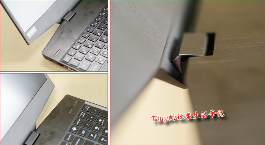 ▲背蓋(A面)的正面細節,雖然是塑料射出成型,但是髮絲紋的設計,與看還真有金屬感,會誤以為這是金屬背蓋。在散熱孔上方,背蓋則是較為退縮的設計,打破了一般背蓋與鍵盤面一致大小的傳統設計,多了點跑車戰鬥氣息,也更流線化,造就了另一番不同的獨特品味。