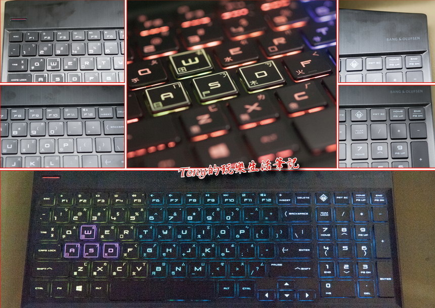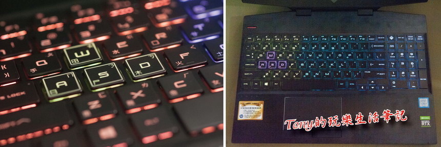 ▲鍵盤一共分為四區,特別是《A、W、S、D》四鍵獨立為一區,除了鍵面上有特別加框標示,就連燈光都能利用內建搭配的控制軟體去做這四區的燈光顏色改變。這我只見過全區是同一燈光顏色,且是固定不能變色的,第一次在《HP OMEN 15筆記型電競電腦》上看到這樣的設計,也是能瞭解這真的是為了電競玩家再特別增加的新功能,不得不說這對電競玩家真是非常貼心的設計。