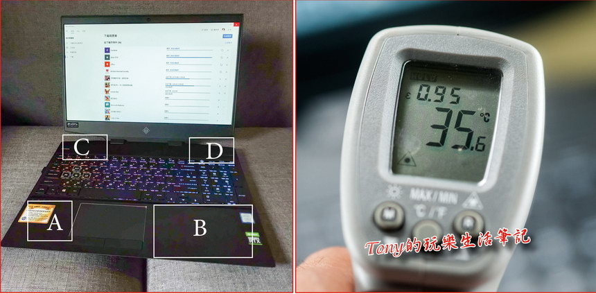 ▲散熱度應該是所有電競玩家與中重度使用者很在意的一件事,從散熱度的表現,分別是A區最好,再來是B區,然後C區,最熱的是集中在D區。但各區之間的同時間熱度大約都差在1~3度之間,以我所量測的來說,最常用手去跨放的是AB區,溫度都落在38度以下,而最熱的D區,即使是在滿載的運作下,溫度也都不超出43度以內(當然這是指用我的溫度計去量出來的結果)。但就這溫度來說,並不會比我用的老舊筆電溫度還高,但是卻能夠提升數倍的運作,這真的是超乎我的想像,看來《HP OMEN 15筆記型電競電腦》應該也有超頻的可能吧!