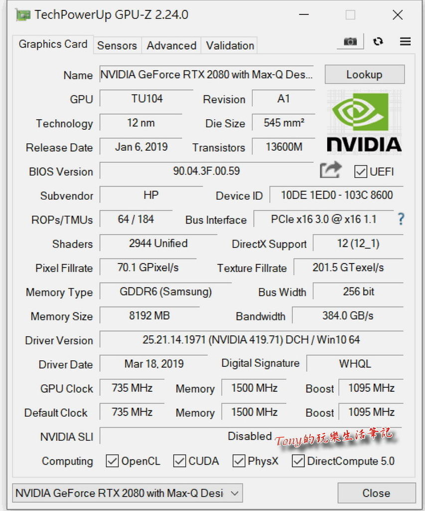 ▓【NVIDIA GEFORCE RTX】這可是不簡單的,竟然在《HP OMEN 15筆記型電競電腦》上面用了最新的《NVIDIA GeForce RTX2080 with Max-Q Design》獨立顯卡,這可是NVIDIA最新最強大的顯示核心了!(我之所以知道是因為我前面提到開網咖的大哥,他都只用最新最強大的周邊,連他都早就換用RTX2080了,有他的認證使用,RTX2080肯定絕對是最好的)