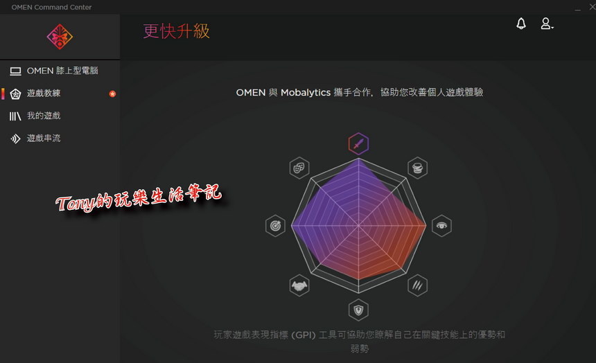 ▲在電競比賽時,先透過遊戲教練的玩家遊戲表現指標(GPI)工具來調整自己的設定,更能達到最優化的遊戲體驗。