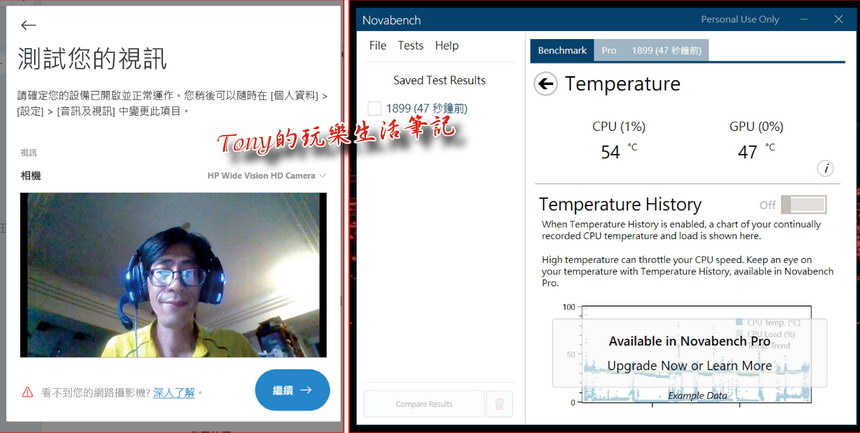 ▲另外內建的攝影機,可以提供簡單的視訊對話與線上直播。還有就是透過程式測試,硬體表現都在高度運作下,溫度依然可以控制的很棒,這點在《HP OMEN 15筆記型電競電腦》來說,已經做到了一台旗艦機種必要具備的效能與穩定。