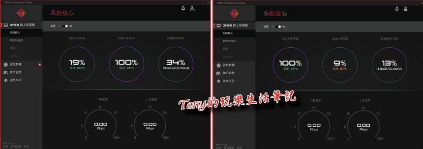 ▲透過不同的應用程式,將CPU及GPU都拉到100%的效能使用,再透過《OMEN Command Center》來看到效能與溫度的控制,更能隨時調整成舒適或效能模式來提升電力使用或高度效能使用。