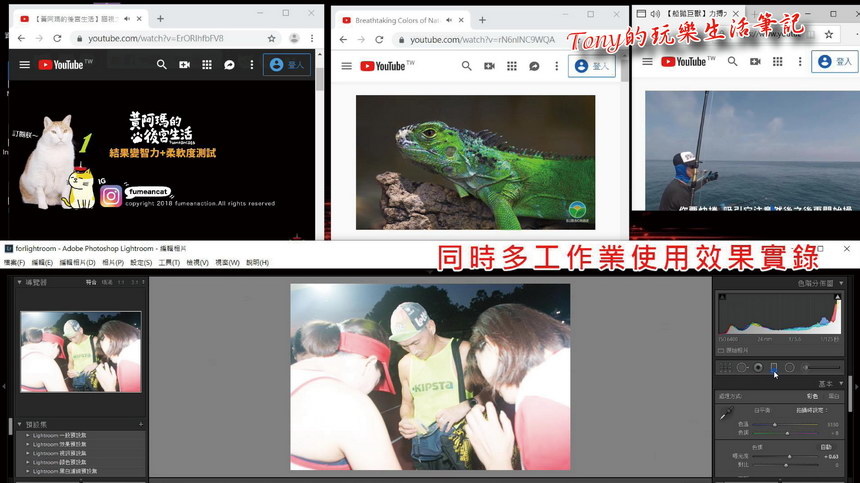 ▲更有趣的實驗,一邊做LightRoom的修圖調整,一邊還同時開了三個Youtube影片播放,依然是順暢不卡卡,《HP OMEN 15筆記型電競電腦》完全把電腦該有的效能表現的毫無保留了。