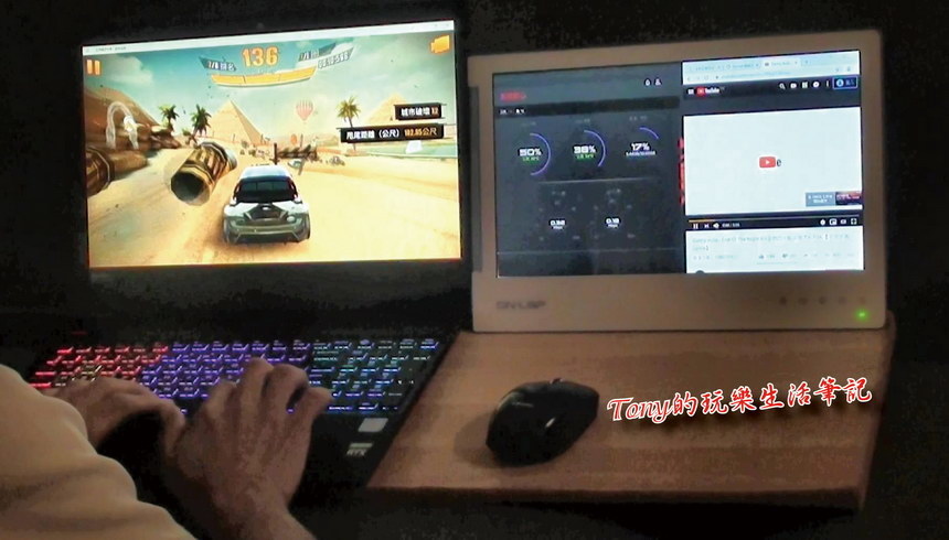 一邊是玩電競賽車遊戲,另一邊是開YOUTUBE影片播放及監控程式,雙螢幕輸出。同時玩電競及播放影片,一點都沒有遲鈍,非常的流暢。