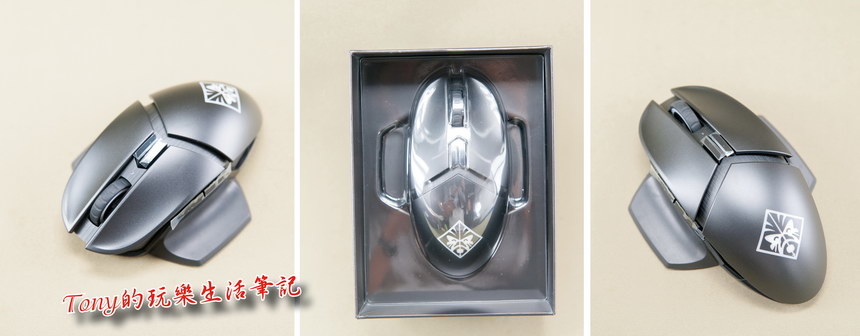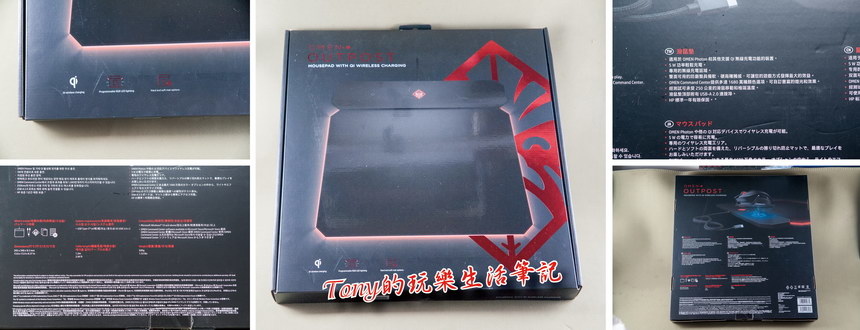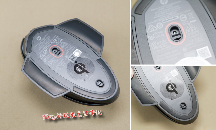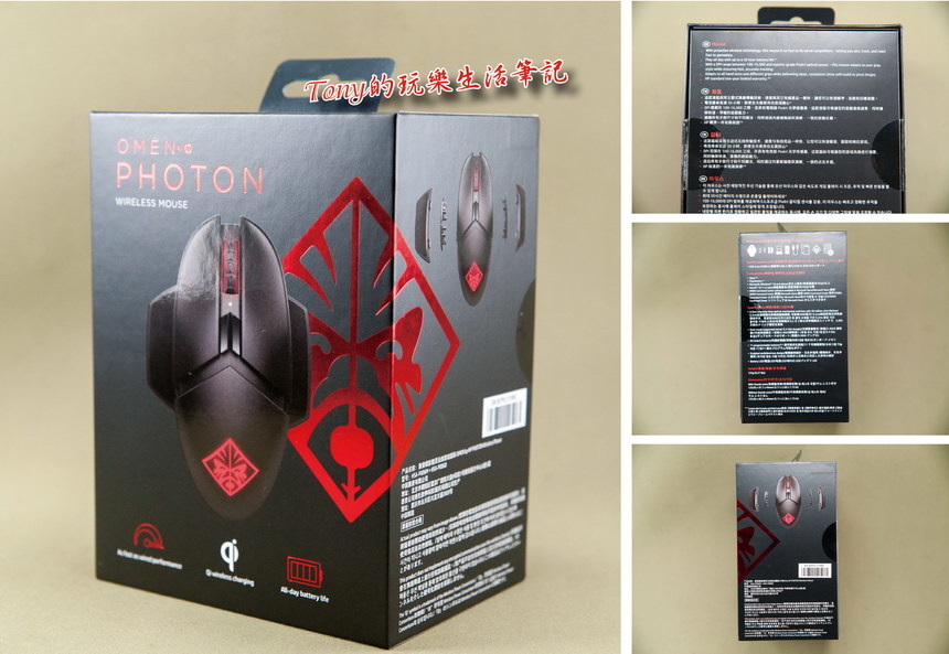 後來注意到外盒正面下方中間,有個熟悉的圖形,原來《Omen Photon Mouse》內建有Qi無線充電單元,這樣就可以在晚上不用電腦時,讓它自行充電了。