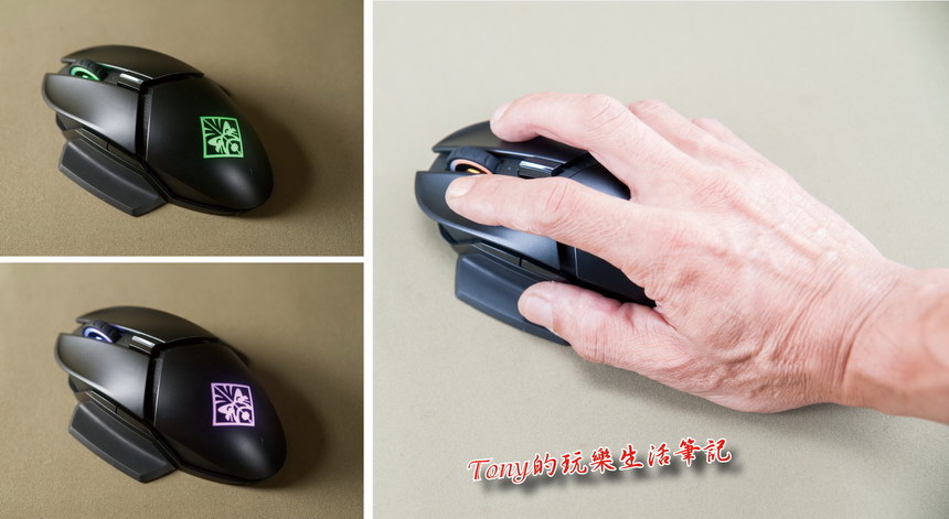 ▲在滾輪圈內跟鼠身的LOGO標示都有RGB LED 燈會發光,除了會依隨機變化燈光外,也可以自行透過設定,個性化自己專屬的外觀發光顏色。而同時手握的握感非常的順手,手指靠在蝶翼上面,手指就不再去磨到滑鼠墊了,更舒服多了。而按鍵的回彈力真的滿Q彈的,只要輕點就可以動作,反應很快。根據資料,《Omen Photon Mouse》的點擊響應時間,在HP的無線技術下,響應時間被控制在 0.2 毫秒內,真的很快速。