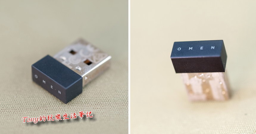 ▲藍芽無線收發器,我是找不到可以收納進鼠身的方式。在USB插頭的金屬面上,竟也還有印上OMEN LOGO的標示,連這小地方都做了特別的標示,這不怕哪天掉了,然後自己忘了是哪個滑鼠使用的了。