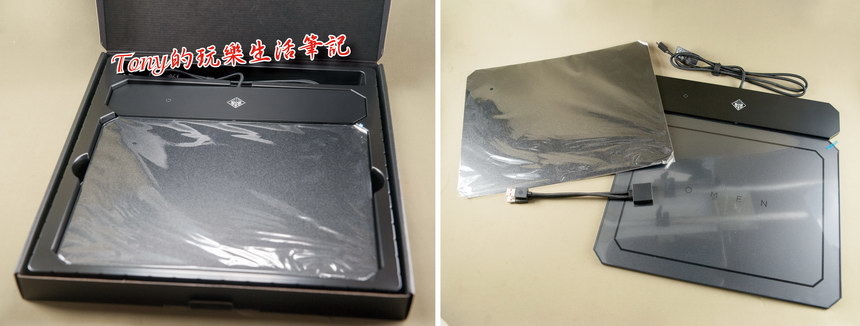 ▲《OMEN Outpost Qi 無線充電滑鼠墊》除了主板外,還有一片雙面(軟與硬雙面)的滑鼠墊。在使用上,我個人因為都用軟墊習慣了,所以用起軟墊面真的滿習慣滿好用的。