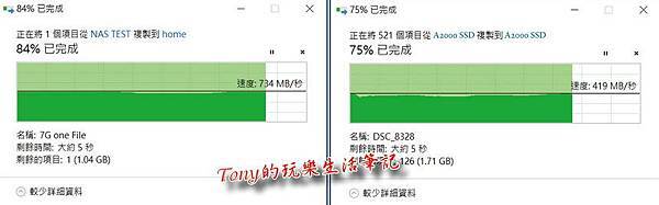 ▲這邊是我用《Kingston A2000 SSD 固態硬碟》本身複製的過程,真正的速度應該是可以到達1GB以上的,但可能我有某個地方沒設定好,有時快有時慢,但再怎樣都能輕鬆的超越了SATA3固態硬碟的速度。但就複製檔案,從過去的100MB, 來到750MB,至少加快了7.5倍,單就這時間,過去要花一個多小時複製的檔案,現在也只要不到10分鐘就完成了,這真的會要哭啊!過去浪費太多太多的時間了。