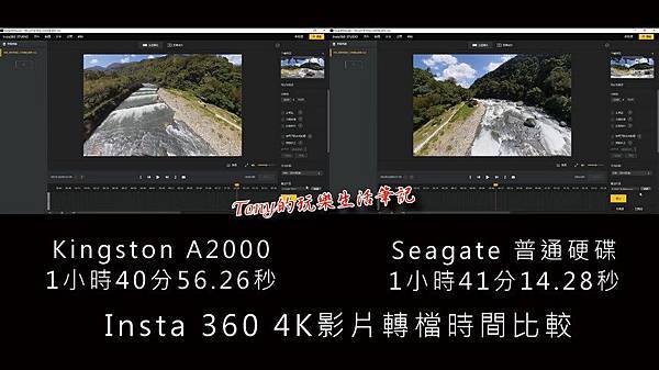 ▲第三個則是測試比較吃重CPU運作的4K影片轉檔的速度,這部份所有的時間幾乎都是CUP在運作為主,但還是測試驗證一下在做圖片影片轉檔時,《Kingston A2000 SSD 固態硬碟》與傳統機械硬碟還能有多少優勢。我特別拉了一段很長時間的影片。拉長時間來看看差別。時間分別是1小時40分56.26秒與1小時41分14.28秒。看起來當轉檔運作下,讀寫過程應該是配合CPU運作的,所以這部份就不再是看硬碟的效率,而是看CPU能有多少效能了。