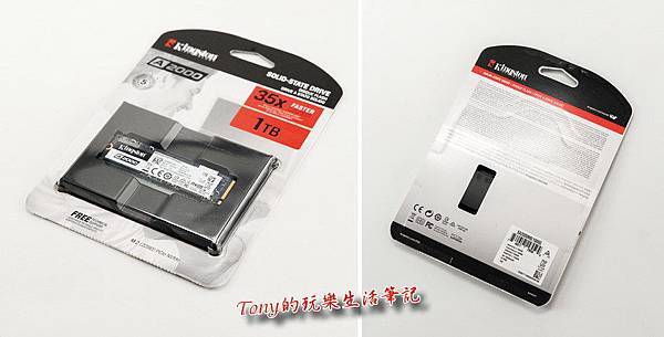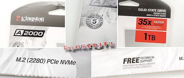 ▲《Kingston A2000 SSD 固態硬碟》吊卡上滿滿的規格資訊都揭露出來。像是五年保固(一台筆電用五年也夠久了,也應該出了更大容量更快速度的SSD固態硬碟,這樣真的很夠用了)。容量是1TB,速度大約是普通7200轉的硬碟35倍的讀寫速度(那如果是5400轉的硬碟的話,不就差多倍了﹖)還有這是《M.2 (2280)NVMe PCIe 3.0 x4》,這個因為是2280的規格,有些機板因為空間問題,會裝不下2280這麼長的SSD固態硬碟,也是需要注意的。還有免費的原廠服務支援,這麼好的軟硬體服務,CP值真的是爆錶了,因為《Kingston A2000 SSD 固態硬碟》本身的價格就很平價了,再加上有這些後端服務與保固,真是超值了。