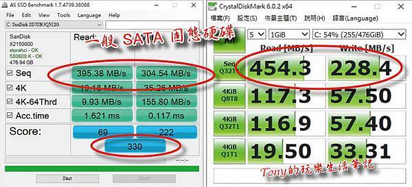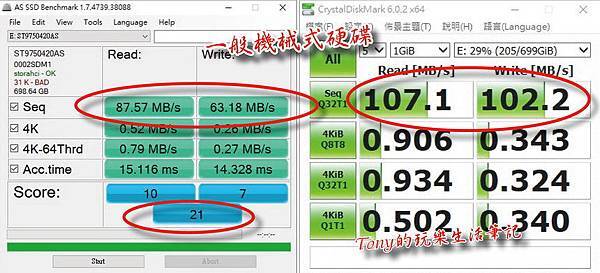 ▲以下我是用《AS SSD Benchmark》及《CrystalDiskMark》這兩套軟體來看看各種不同硬碟的速度比較。這張圖是傳統的機械硬碟速度,才100MB左右,現在看起來,真的是受不了的慢啊!