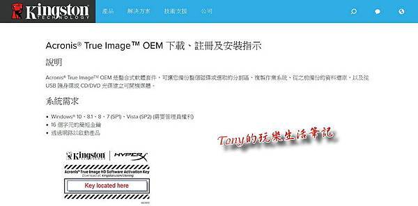 ▲上圖的序號就是用來下載這套《Acronis True Image OEM》程式。這個程式是可以《備份整個磁碟或選取的分割區》、《複製作業系統》、《從過去的備份資料還原》、《從USB隨身碟或CD/DVD光碟建立可開機媒體》等幾個功能。有購買《Kingston A2000 SSD 固態硬碟》的話,一定要去下載來用,這可是非常好的小幫手。